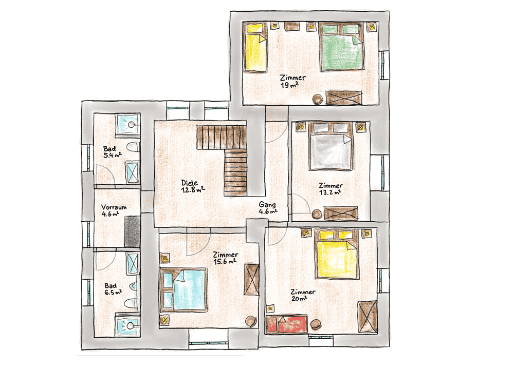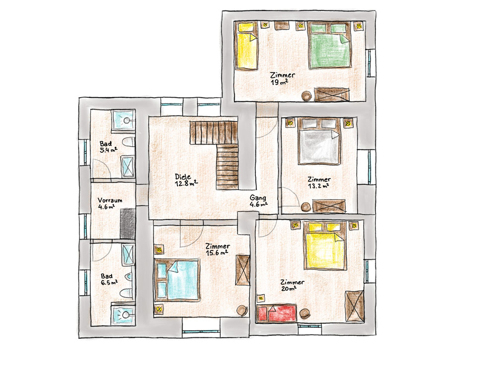 - 4 geräumige Schlafzimmer (2 Doppel- und 2 Dreibett-Zimmer)